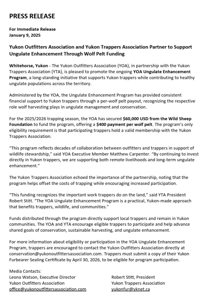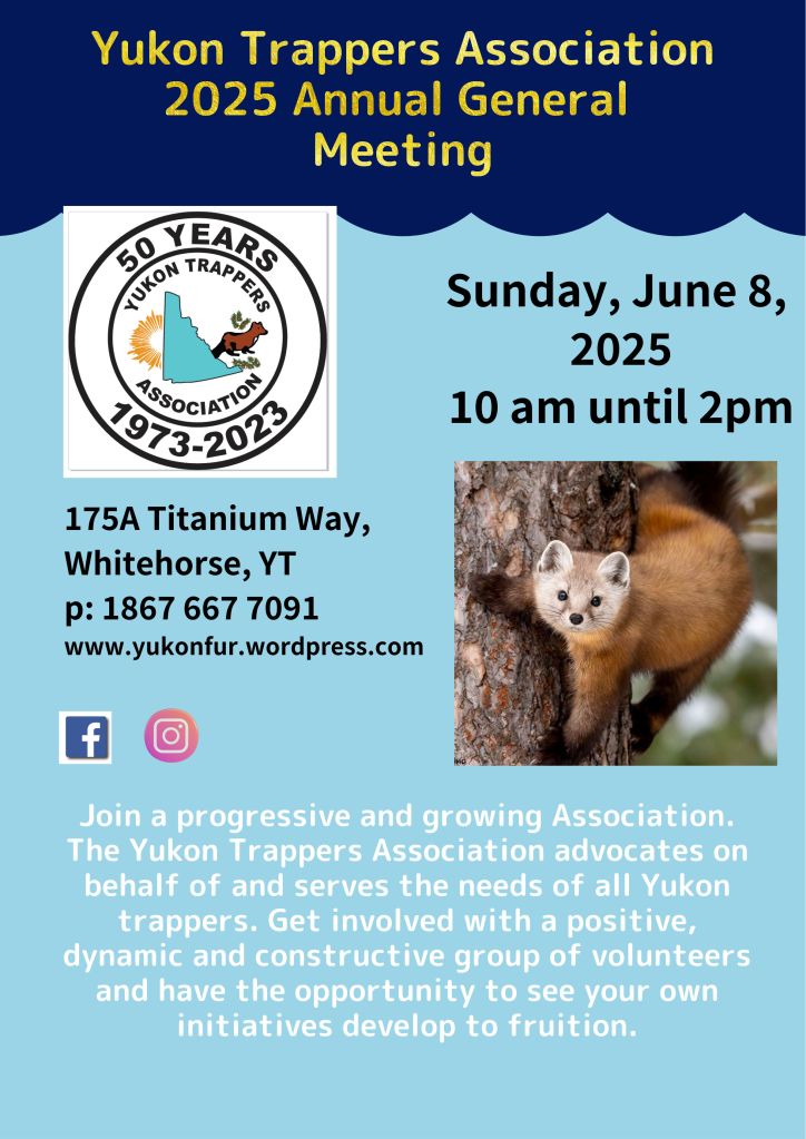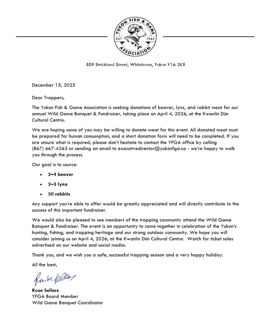 Our friends at the YFGA are looking for meat donations for their Wild Game Banquet and Fundraiser on April 4, 2026. If you’d be able to donate beaver and snowshoe hare (lynx is taken care of!), please email us at yukonfur@yknet.ca and we’ll let you know what is needed (how they’d need the meat prepared). Thank you!