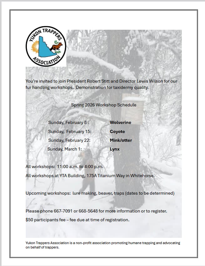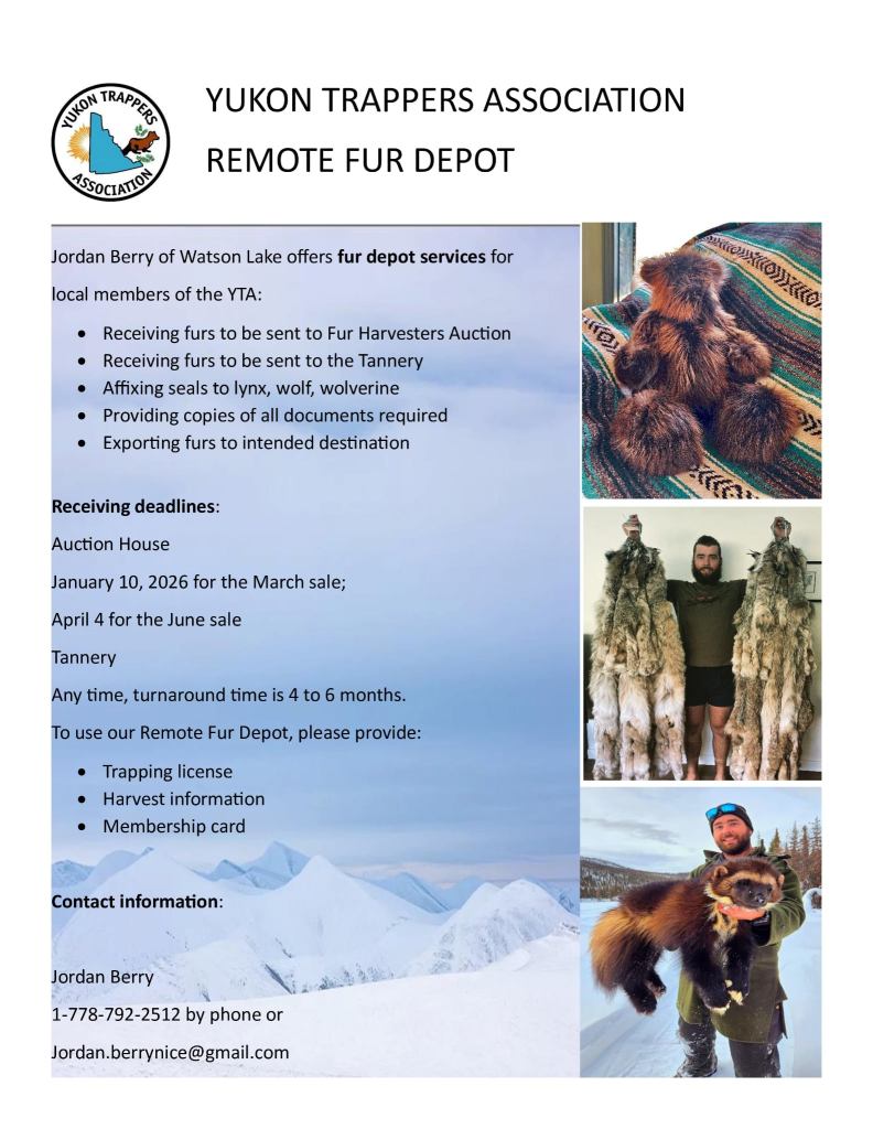 Please note: Your furs need to be received at YTA in Whitehorse on or before the following dates: Saturday, January 10, 2026 and Thursday, April 2, 2026 (Easter weekend).